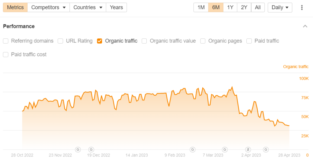 See below a chart showing one of the most important Cancer.gov web pages’ recent drop in organic traffic: