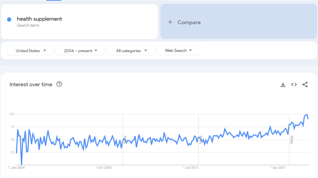 Moreover, the number of health-conscious individuals is rapidly growing, as evidenced by the increasing search volume trend for keywords like “health supplement.”