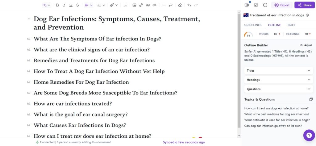 In the screenshot below, I asked SurferSEO to generate an outline for the keywords “Treatment of ear infection in dogs”. This is what the tool came up with within a few seconds only: