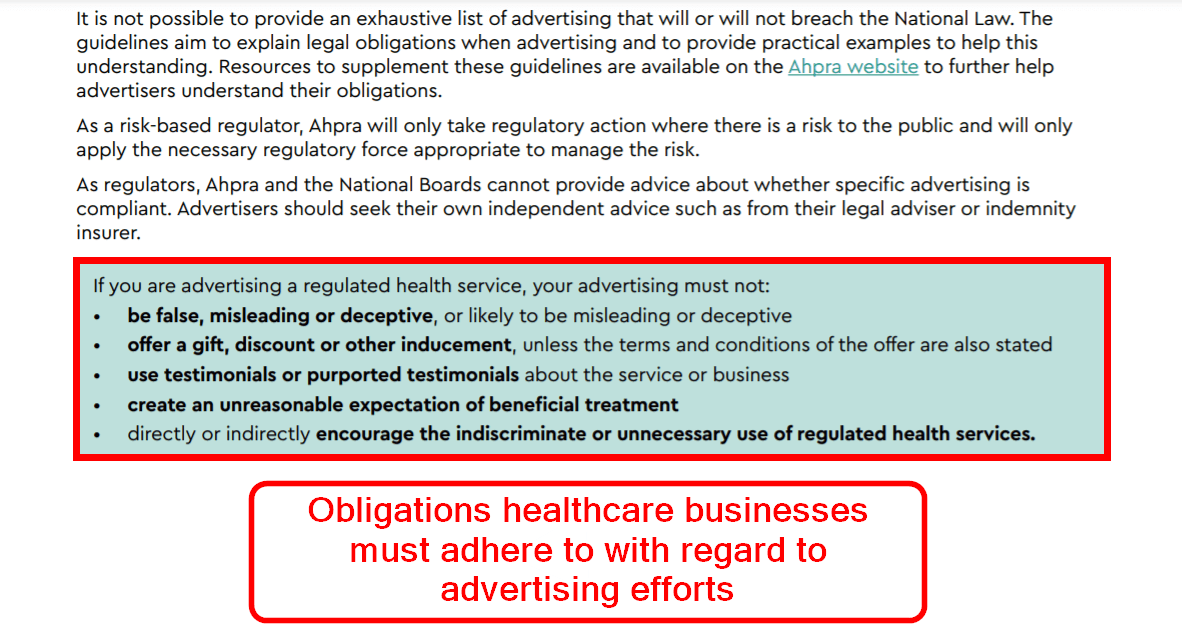 More specifically, healthcare businesses must be compliant with The Health Practitioner Regulation National Law, also known as the National Law. It dictates the obligations regulated health services must adhere to in all advertising efforts.